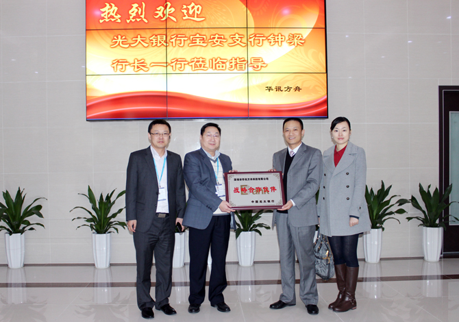 2012年12月27日,中國光大銀行深圳寶安支行行長鐘梁一行蒞臨華迅方舟集團,向集團贈送了承載著光大寶安支行與華訊方舟集團深厚合作情誼的“戰略合作伙伴”牌匾